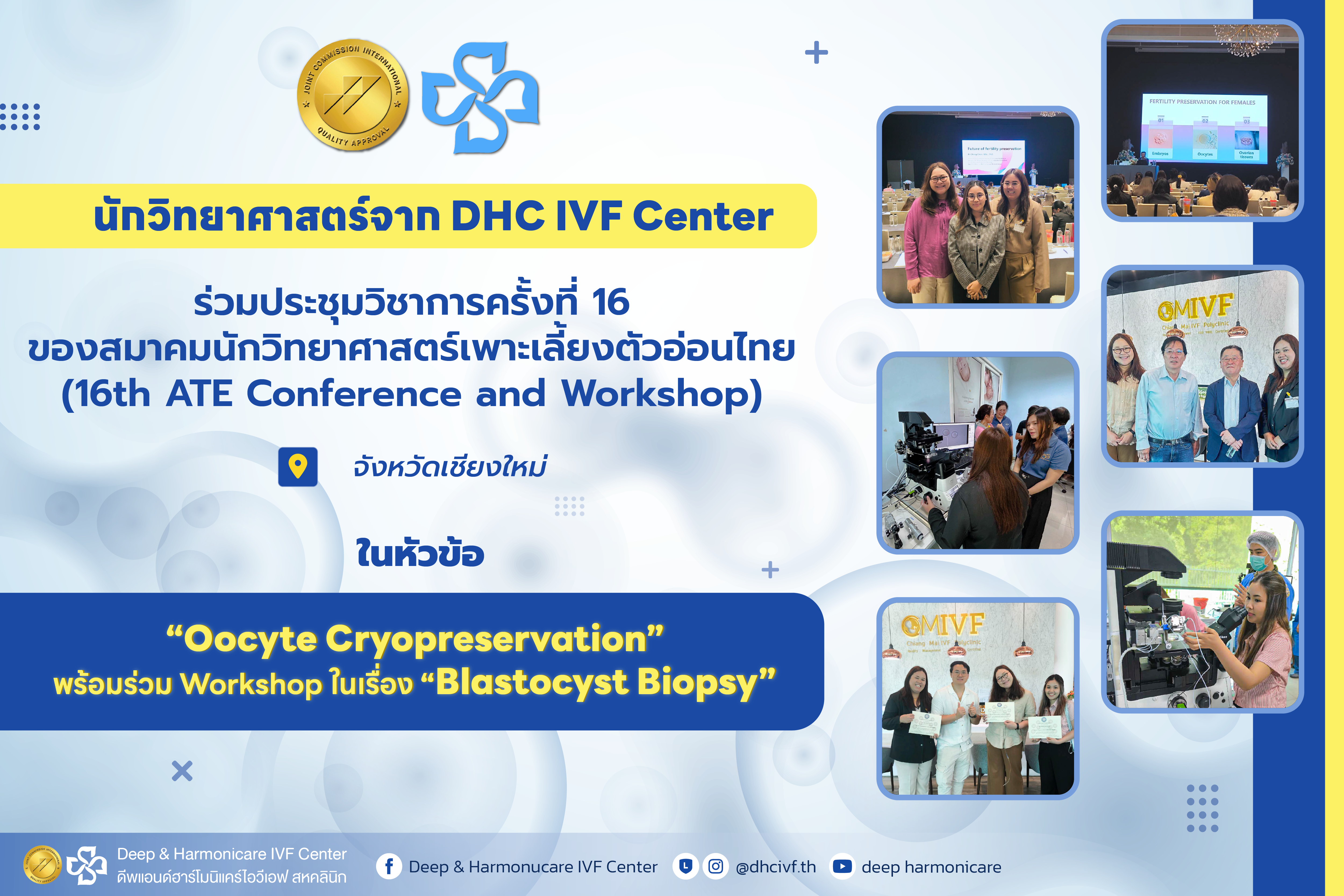 หลังจากที่ทางคลินิก Deep and Harmonicare IVF Center ได้นำทีมตัวแทนนักวิทยาศาสตร์เพาะเลี้ยงตัวอ่อนไปเข้าร่วมประชุมสัมมนาเชิงวิชาการในงาน 16th ATE conference and workshop ณ ศูนย์ประชุมนิมมาน จังหวัดเชียงใหม่