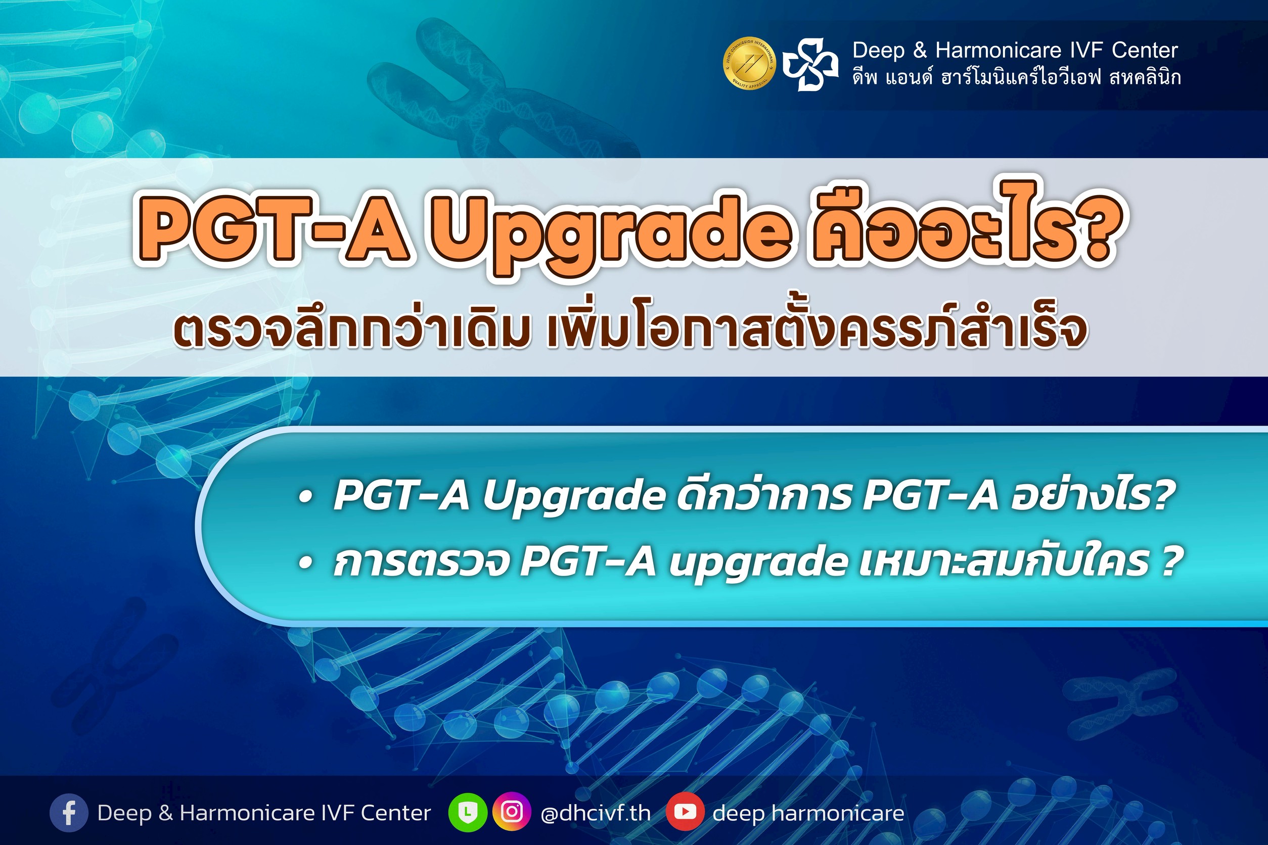PGT-A Upgrade เป็นเทคนิคการตรวจคัดกรองความผิดปกติของจำนวนโครโมโซมในตัวอ่อนก่อนการฝังตัว โดยใช้เทคนิค Copy Number Variation (CNV) ร่วมกับ Single Nucleotide Polymorphism (SNP) เพื่อวิเคราะห์ความผิดปกติของจำนวนโครโมโซมได้อย่างละเอียดและแม่นยำยิ่งขึ้น รวมถึงสามารถคัดเลือกตัวอ่อนที่มีความสมบูรณ์ และเพิ่มโอกาสของการตั้งครรภ์ที่ประสบความสำเร็จ